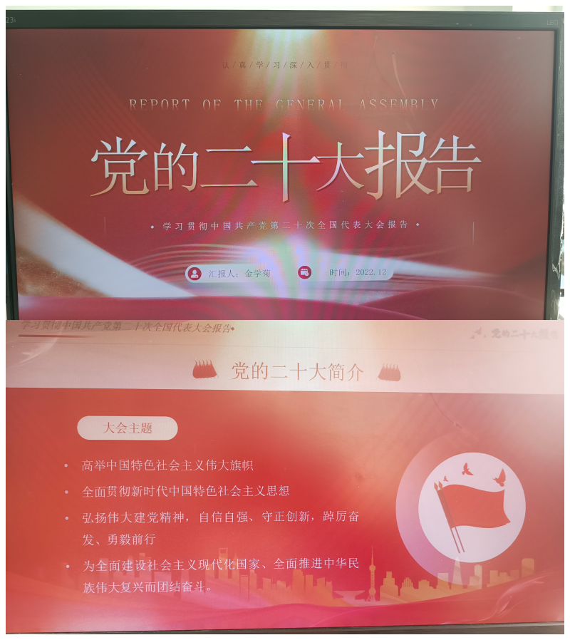 金學菊從深刻理解把握過去五年工作和新時代十年偉大變革的重大意義、習近平新時代中國特色社會主義思想的世界觀和方法論、以中國式現代化全面推進中華民族偉大復興的使命任務、以偉大自我革命引領偉大社會革命的重要要求、團結奮斗的時代要求等方面,對二十大精神作了系統宣講,讓大家進一步深刻認識到二十大精神對我們所處的這個時代和國家的重要意義。隨后黨員代表結合工作實際作了主題發言。他們表示,在今后的學習、工作中要切實把二十大精神轉化為強大的精神動力,不斷武裝頭腦、指導實踐、推動工作。