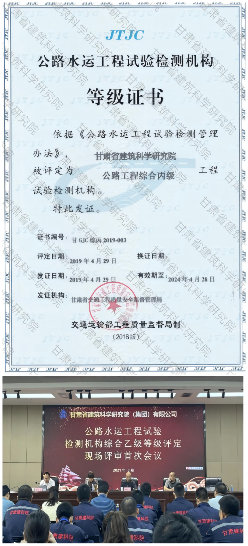 資質是企業進入市場的準入證,也是企業生存和發展的命脈。甘肅建科院于2019年獲得公路工程試驗檢測綜合丙級等級證書,被準予按照《等級證書》核定的業務和范圍從事公路工程試驗檢測活動,2021年升級為公路工程綜合乙級資質。讓公司的企業資質得到了進一步的鞏固和提升,在相關領域得到進一步擴展,在資質建設上取得的長足進步。