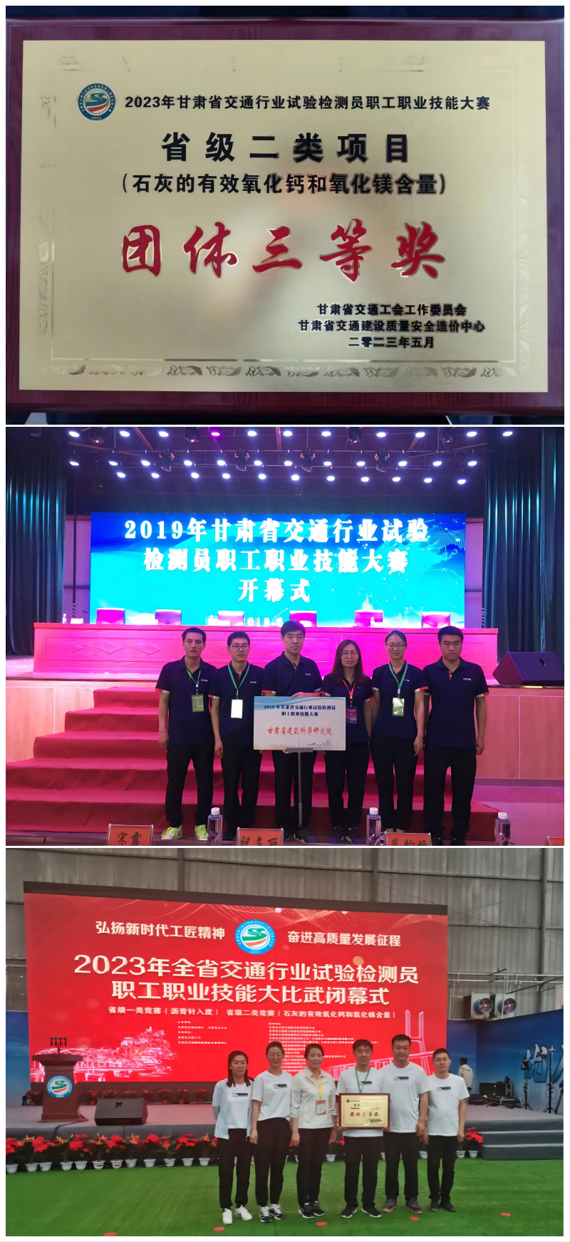 2023年市政公路專業事業部在由省百萬職工職業技能素質提升活動組委會、甘肅省交通運輸廳舉辦的“甘肅省交通行業試驗檢測員職工職業技能大賽”活動中,取得了團體和個人獎項。在全省公路工程試驗檢測機構和在建項目工地試驗室比對試驗中獲“滿意”結果。