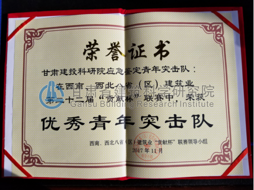11月7日-10日,西南、西北八省(區)建筑業第二十二屆“貢獻杯”聯賽總結表彰會暨青工工作研討會在云南建投集團舉行。我院岷縣應急鑒定突擊隊的優異表現得到了西南西北八省區建筑業青年的認可,榮獲優秀青年突擊隊稱號,為我院和集團總公司爭得了榮譽。共青團云南省委副書記趙國良,集團公司黨委副書記、副董事長李家龍,甘肅建投集團黨委副書記、紀委書記張育謙,貴州建工集團黨委副書記程銳出席本次會議。
