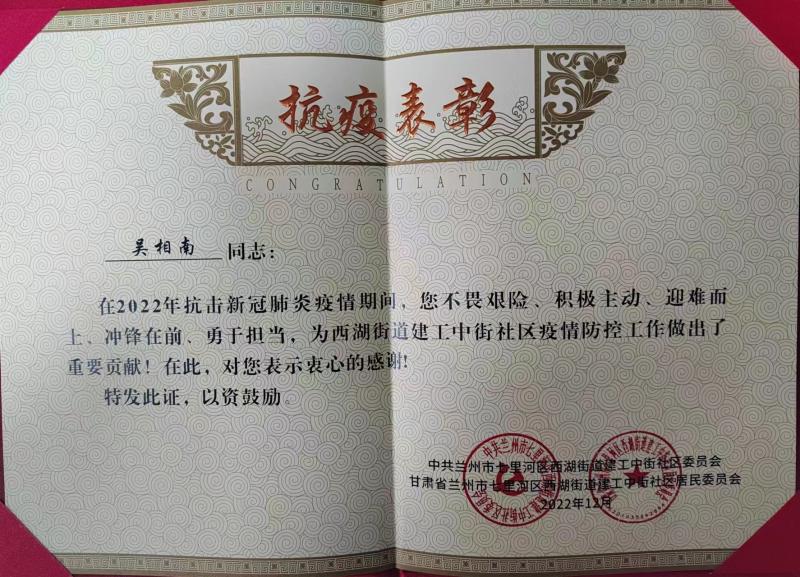 面對疫情,甘肅建科院積極行動,彰顯社會擔(dān)當(dāng)。2022年7月,甘肅建科院職工主動請纓投身到志愿者隊伍中,在志愿者崗位上為抗擊疫情貢獻力量。甘肅建科院市政公路專業(yè)事業(yè)部吳相南被蘭州市七里河區(qū)西湖街道建工中街社區(qū)委員會和居民委員會授予榮譽證書。8月4日,甘肅建科院黨委慰問日夜奮戰(zhàn)在防疫一線的醫(yī)護人員、社區(qū)工作者及青年志愿者,為他們送去抗疫物資,助力蘭州疫情防控工作。