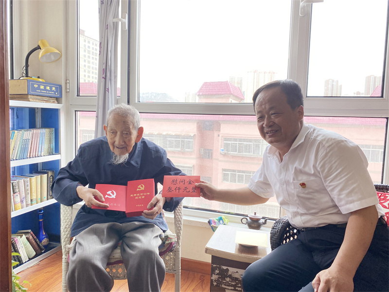 紀委書記、工會主席閻新明及機關部室相關負責人走訪慰問了黨齡50年的100歲離休黨員薛篤昶老人。由于百歲老人薛老與中國共產黨同壽,“雙百”可謂錦上添花,好事成雙。當閻新明將“光榮在黨50周年”紀念章頒發給薛老時,老人滿含熱淚表達了對中國共產黨的感恩和對公司各位領導的真誠感謝。薛老激動地說到:“與黨同齡,是我一生之幸!”