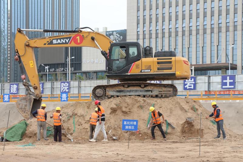 上午10時整,隨著王春景一聲令下,各作業(yè)區(qū)、部室及演練人員迅速到達(dá)指定區(qū)域開始模擬基坑塌陷演練。其設(shè)置情景是:勞務(wù)作業(yè)人員在現(xiàn)場作業(yè)期間發(fā)生土方塌方,該班組安全員發(fā)現(xiàn)了該作業(yè)人員被掩埋,立即上前進(jìn)行施救,并快速將人員信息傳送至項目部應(yīng)急領(lǐng)導(dǎo)小組,報告塌方事故的時間、地點等信息。現(xiàn)場指揮根據(jù)事故情況宣布啟動應(yīng)急預(yù)案,立即通知項目部醫(yī)療小組、安全小組帶上擔(dān)架、藥箱、警戒線立刻趕往現(xiàn)場準(zhǔn)備警戒施救工作,通知救護(hù)車輛進(jìn)場待命。