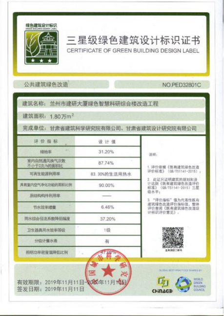 按照《既有建筑綠色改造評價標準》(GB/T 51141-2015),建研大廈綠色改造工程項目評分項達到80分以上,滿足綠色建筑三星要求。經過專家組評審、社會公示,甘肅省建筑科學研究院有限公司建研大廈項目獲此殊榮。