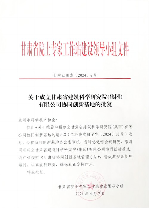 近日,從甘肅省科協獲悉,由甘肅建科院公司申報的“甘肅省建筑科學研究院(集團)有限公司協同創新基地”獲甘肅省院士專家工作站建設領導小組正式發文批復成立,并獲專項資助經費20萬元。這是甘肅建科院公司獲批成立的第一個引進院士專家團隊的科研創新平臺,也標志著甘肅建科院公司在高水平科研平臺建設方面邁出了堅實一步。