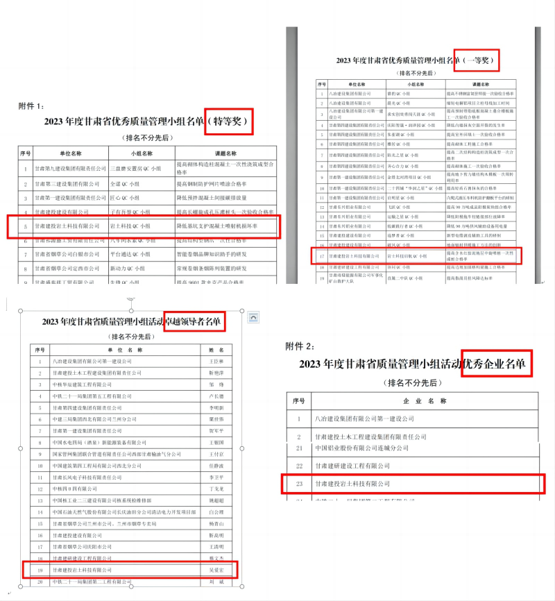 近日,2023年度“甘肅省質(zhì)量管理小組活動(dòng)成果獎(jiǎng)”揭曉,建投巖土科技公司被評(píng)為“2023年度甘肅省質(zhì)量管理小組活動(dòng)優(yōu)秀企業(yè)”,2項(xiàng)QC活動(dòng)成果取得優(yōu)異成績(jī),其中《降低基坑支護(hù)混凝土噴射機(jī)損壞率》課題榮獲省級(jí)特等獎(jiǎng),《提高含水紅膠泥地層中旋噴樁一次性成樁合格率》課題榮獲省級(jí)一等獎(jiǎng)。“巖土科技QC小組”自成立來已連續(xù)三年榮獲QC活動(dòng)成果省級(jí)特等獎(jiǎng)、一等獎(jiǎng),兩位小組成員分獲“2023年度甘肅省質(zhì)量管理小組活動(dòng)卓越領(lǐng)導(dǎo)者”和“2023年度甘肅省質(zhì)量管理小組活動(dòng)優(yōu)秀推進(jìn)者”榮譽(yù)。