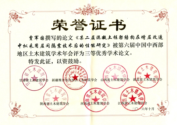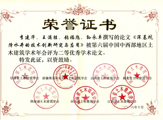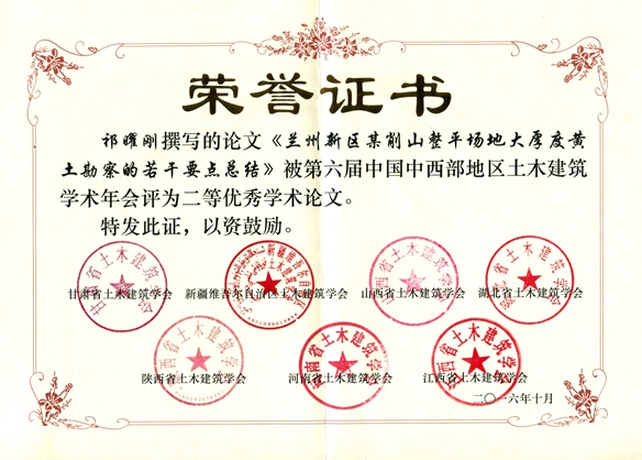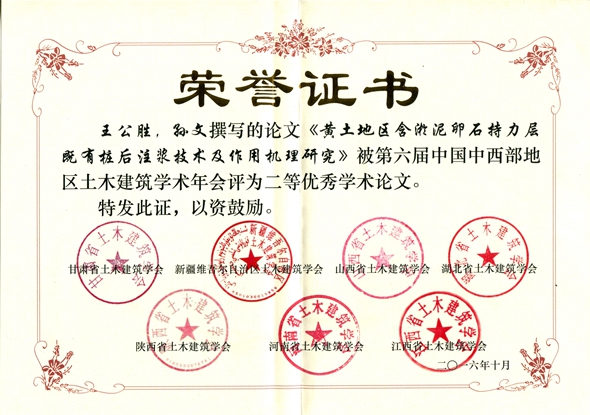 會議分三部分進行:首先是秘書長聯席會,通報第六屆會議準備情況,并探討中西部學會的發展情況;其次是開幕式及學術交流,共有王秀麗等9位教授或高級工程師做主題交流;最后頒發了西部土木工程防災減災青年人才工程獎、中國中西部地區土木建筑杰出工程師獎、優秀論文獎三類獎項。在頒獎儀式上,我院四篇論文分獲第六屆中國中西部地區土木建筑學術年會二、三等獎。其中二等獎3項,分別是:王公勝、孫文同志撰寫的《黃土地區含淤泥卵石持力層既有樁后注漿技術及作用機理研究》;李建華、王滿勝、張福彪、孫永卓同志撰寫的《深基坑降水井的技術創新研究與應用》;祁曜剛同志撰寫的《蘭州新區某削山整平場地大厚度黃土勘察的若干要點總結》;三等獎1項,即賈軍國同志撰寫的《某二層混凝土框架結構在增層改造中擬采用層間隔震技術后的性能研究》。