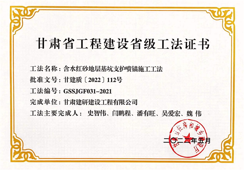 近日,省住房和城鄉建設廳發布甘肅省2021年度工法公告,建科院建研建設公司申報的含水紅砂巖地層基坑支護噴錨施工工法評定為省級工法。