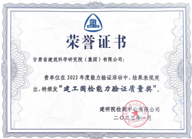 近日,甘肅建科院榮獲由中國建筑科學研究院建筑工程檢測中心頒發的“建工國檢能力驗證質量獎”。