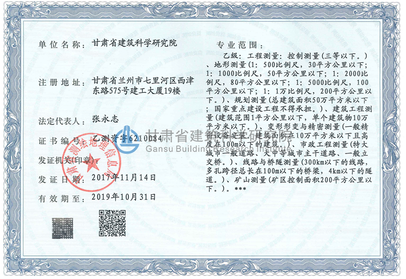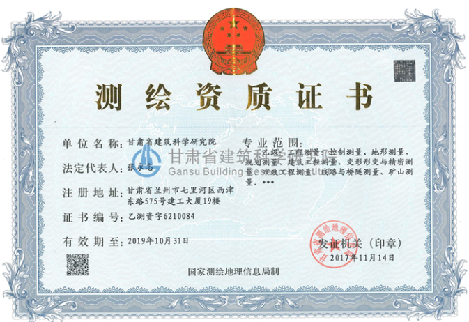 自2015年我院取得測繪丙級資質以來,積極承擔測繪業務,新進測繪專業大學畢業生5人,新增相關測繪儀器10臺(套),建立了完善的測繪成果及資料檔案管理及保密制度,設立了保密工作機構,配備了保密管理人員。為更好的滿足市場需求,進一步提升我院技術水平,擴展我院業務范圍,提高我院技術人員職業素養,我院積極參加甘肅省測繪地理信息局組織的各項測繪相關培訓,如甘肅省測繪地理信息新技術培訓班、新修訂的《中華人民共和國測繪法》培訓班等,所有測繪相關人員均參加測量技術專業培訓并取得技能鑒定中心頒發的測量資格證書,并組織技術人員與蘭州交通大學測繪學院、蘭州理工大學土木工程學院進行技術交流,共同進行相關課題研究及測繪項目完成。